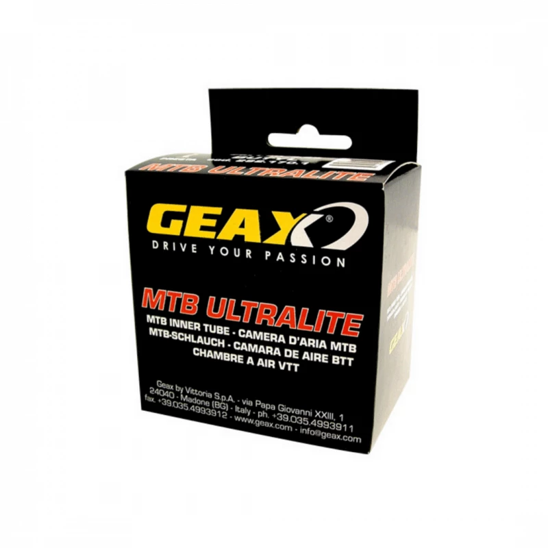 Schrader Pack de 10 Cámaras de MTB Geax – Ultralite 26×1.10/1.50Compatible con todas las marcas de cubiertas y disponible con válvulas Presta y Schrader.